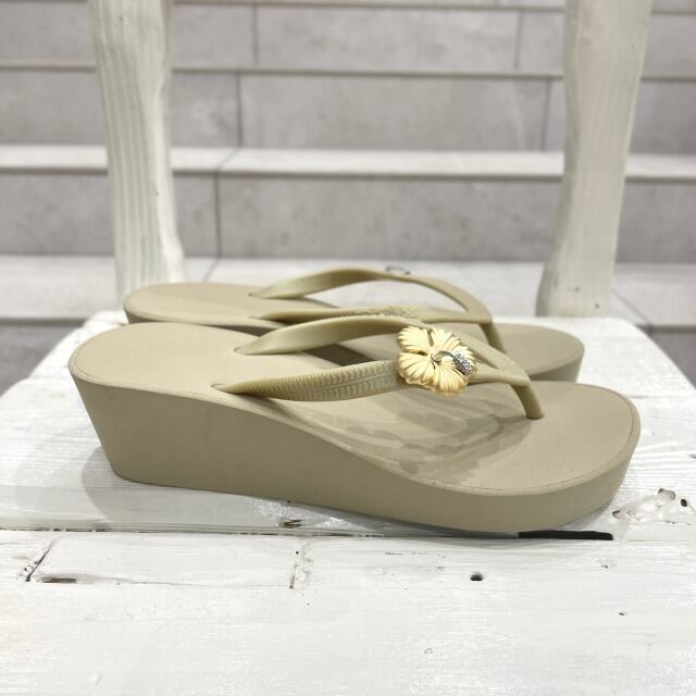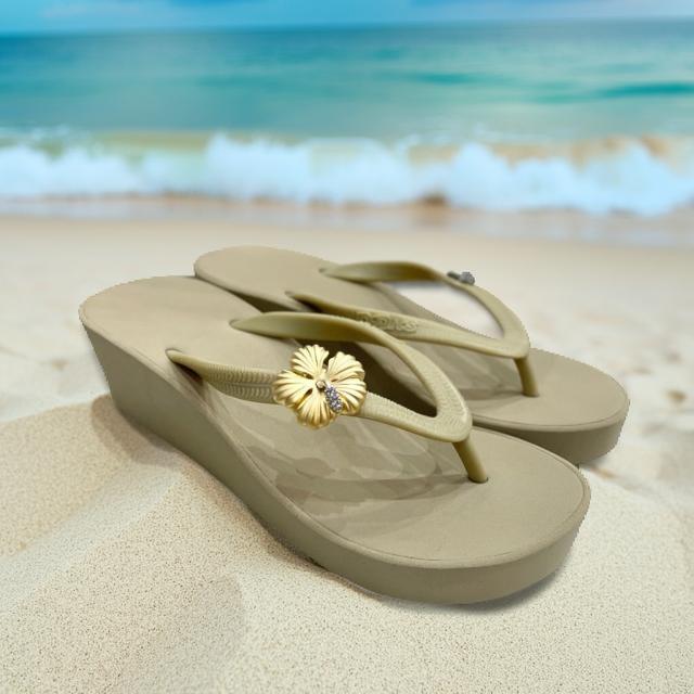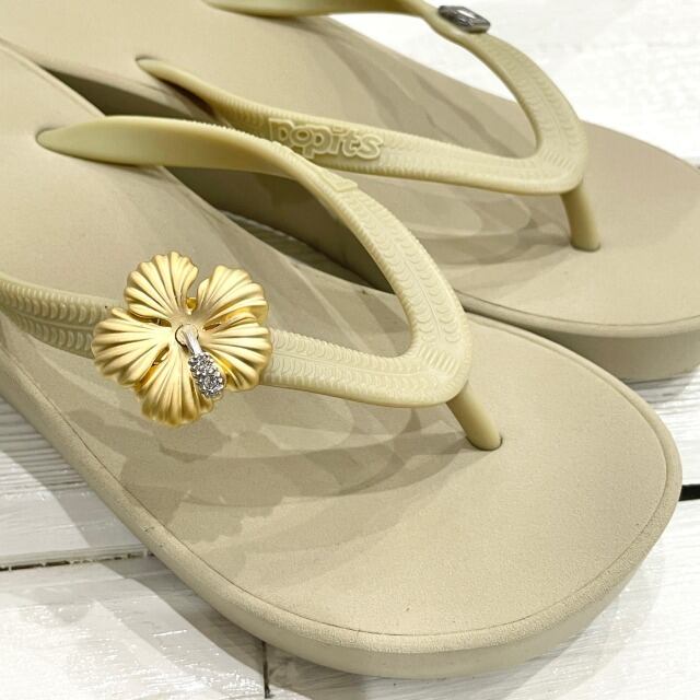 【POPITS】 ポピッツ 【ビーチサンダル】 サンダル XS ベージュ 飾り付き 花 ハイビスカス ゴールド 軽量 厚底 ヒール 女性 レディース ファッション シューズ HAWAII 海外輸入 海 プレゼント