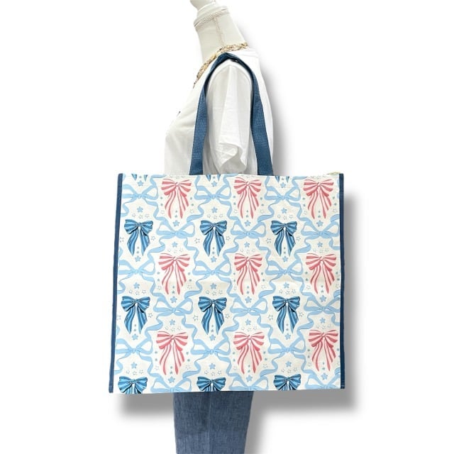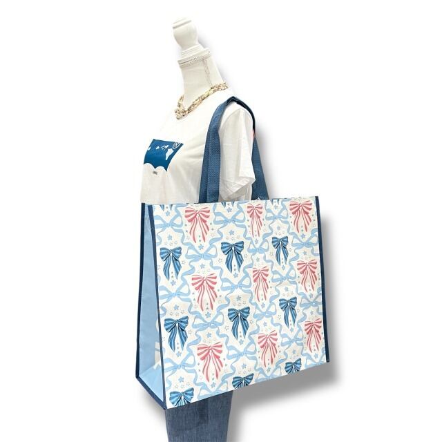【エコバッグ】ポリプロピレン ブルー ピンク リボン ガーリー イラスト トートバッグ ショッピングバッグ マチあり ハワイ HAWAII ハワイ入荷 海外輸入 プレゼント