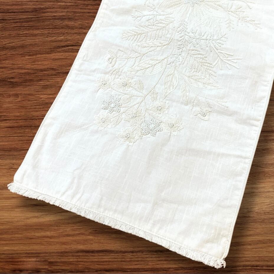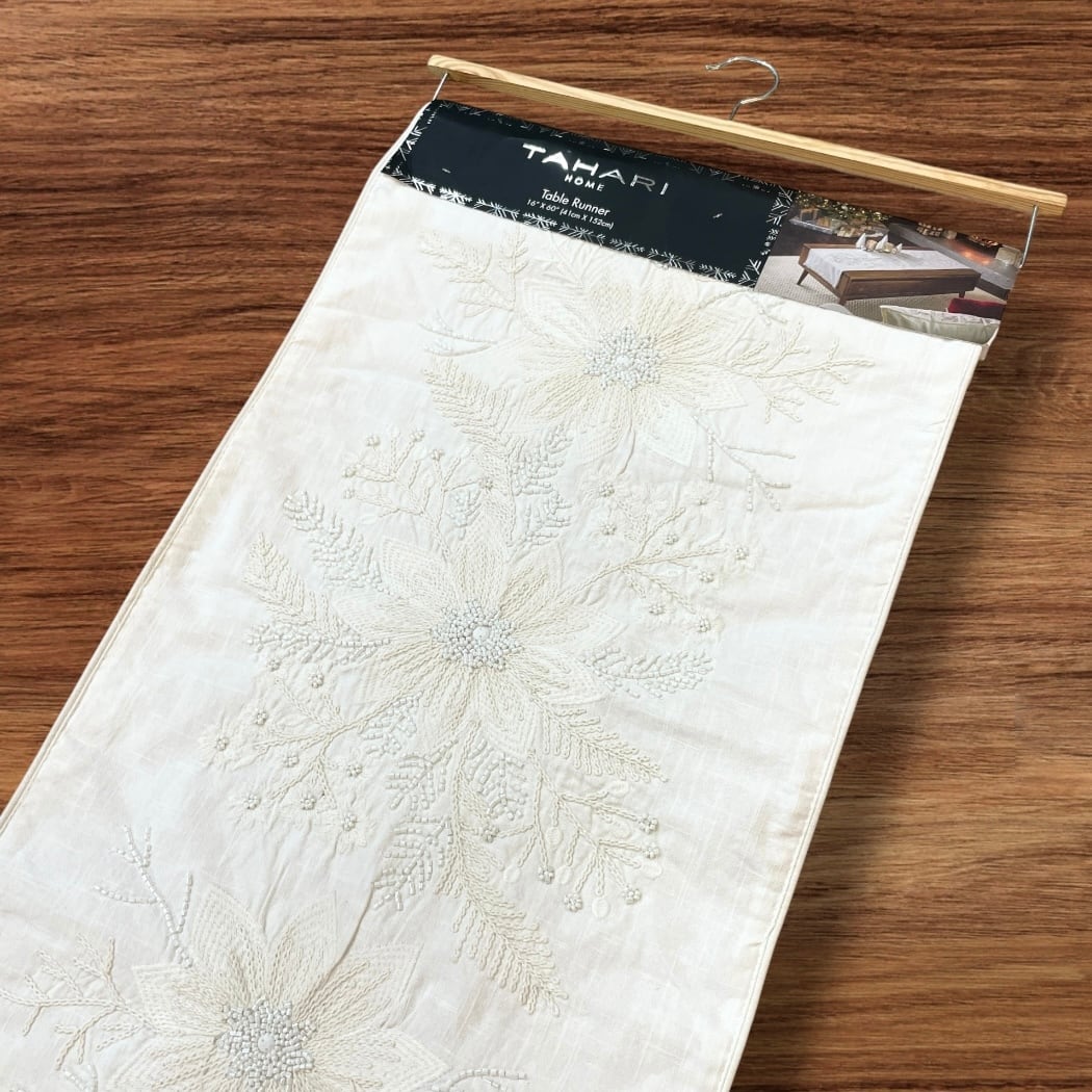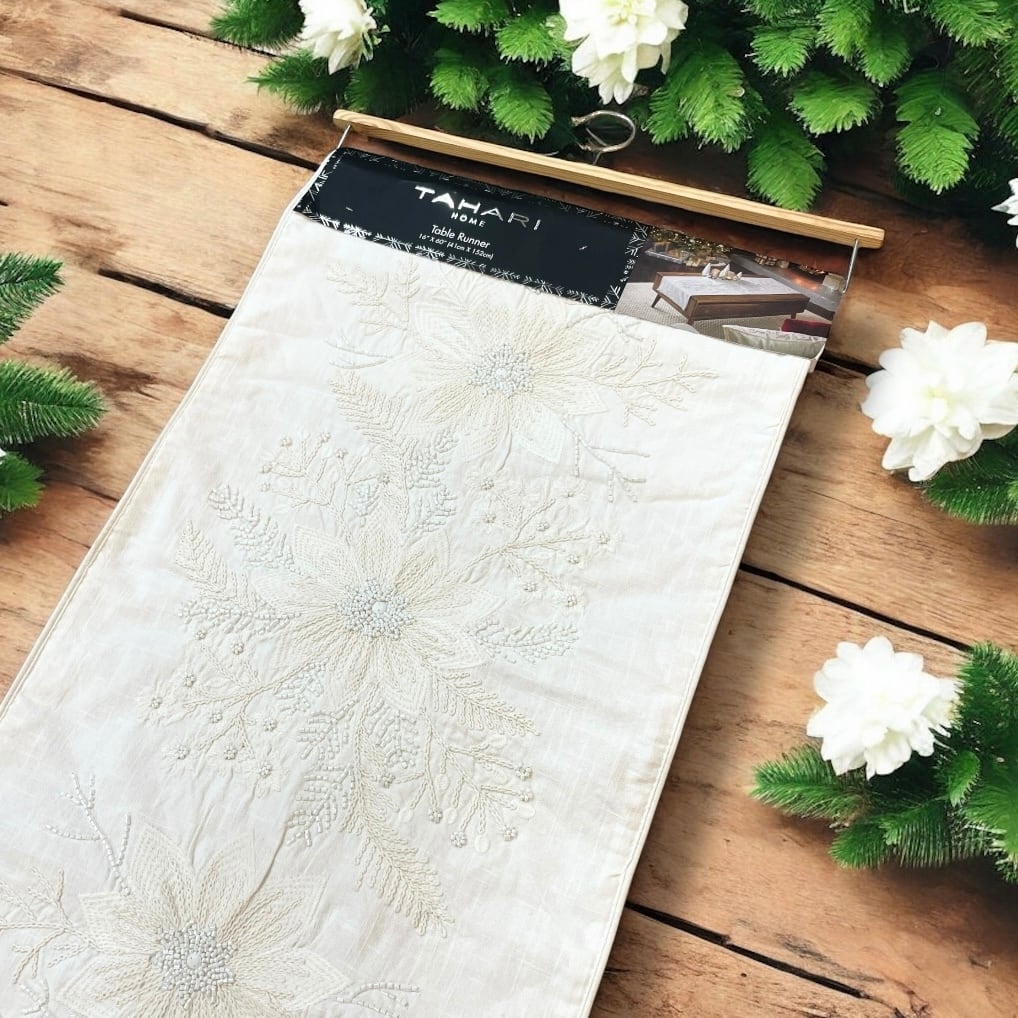 【TAHARI HOME】【テーブルランナー】 クリスマス ポインセチア ビーズ 刺繍 フリンジ ホワイト 生成り アイボリー ダイニング リビング インテリア コットン 敷物 食卓 おしゃれ 華やか 高級感 海外 海外輸入