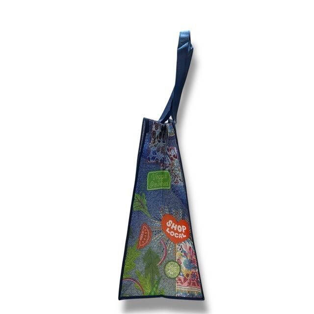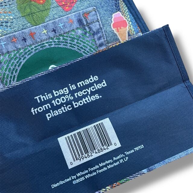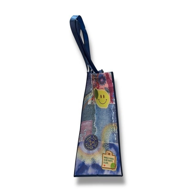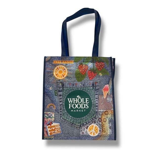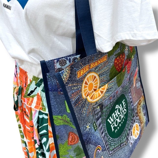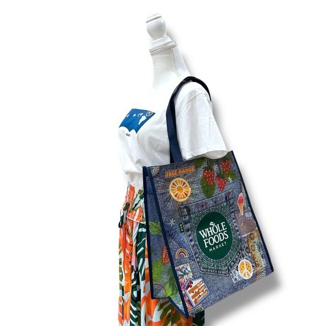 【WHOLE FOODS MARKET】 ホールフーズマーケット エコバッグ トートバッグ ショッピングバッグ リサイクル 大きめ 軽量 不織布 ネイビー ブルー デニム風 カラフル ポップ ハワイ HAWAII エコ エシカル ギフト プレゼント