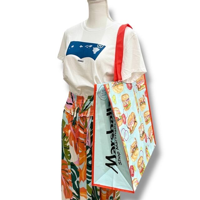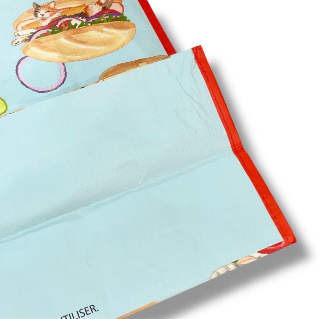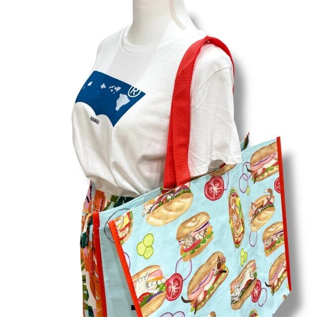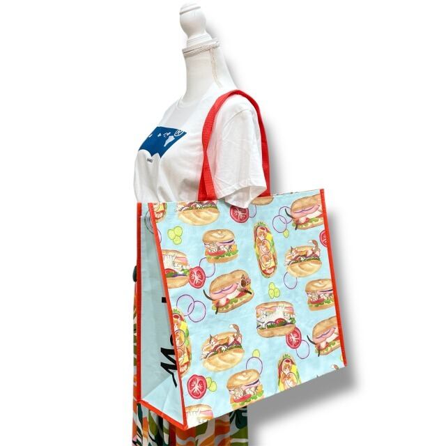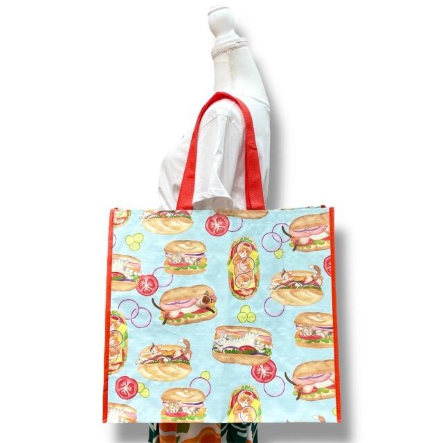 【エコバッグ】ポリプロピレン 水色 レッド 赤 マルチカラー ネコ フード イラスト トートバッグ ショッピングバッグ マチあり ハワイ HAWAII ハワイ入荷 海外輸入 プレゼント