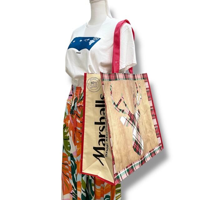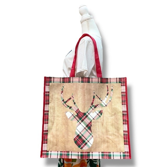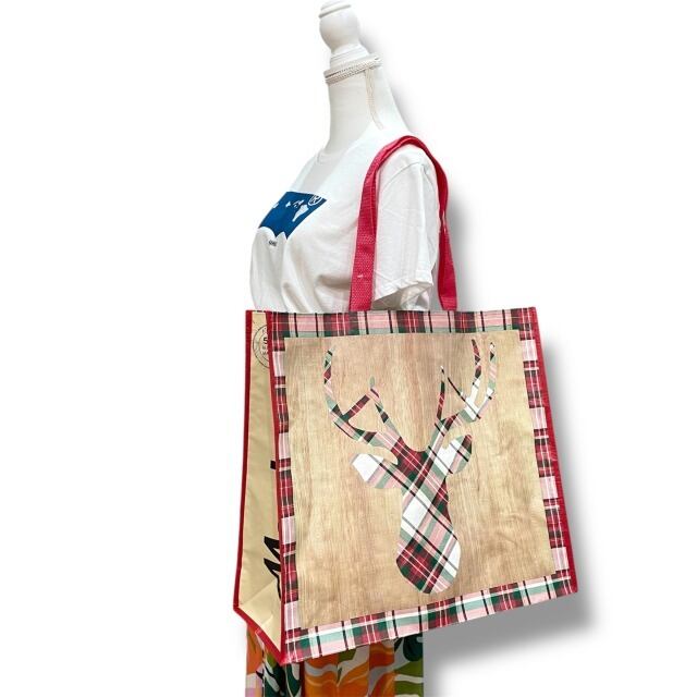 【エコバッグ】ポリプロピレン レッド 赤 ベージュ グリーン 緑 チェック柄 クリスマス トナカイ イラスト ポップ トートバッグ ショッピングバッグ マチあり ハワイ HAWAII ハワイ入荷 海外輸入 プレゼント