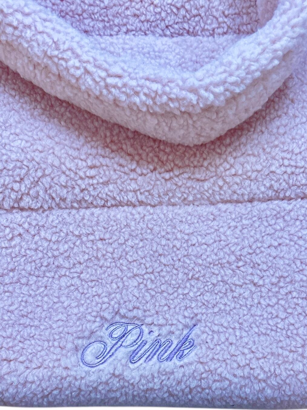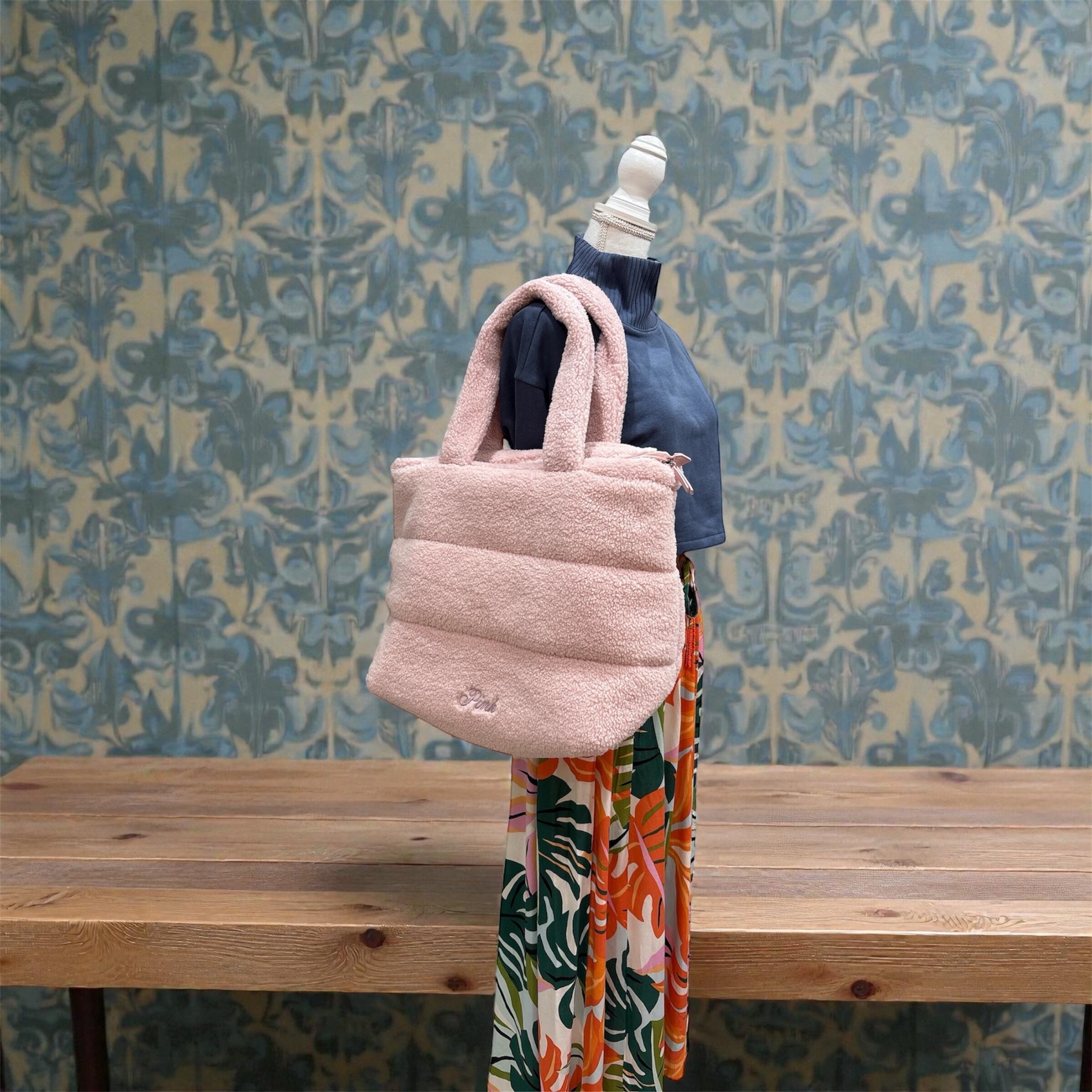 薄いピンクのふわふわモコモコ素材が特徴で、持つだけで暖かさを感じられます。