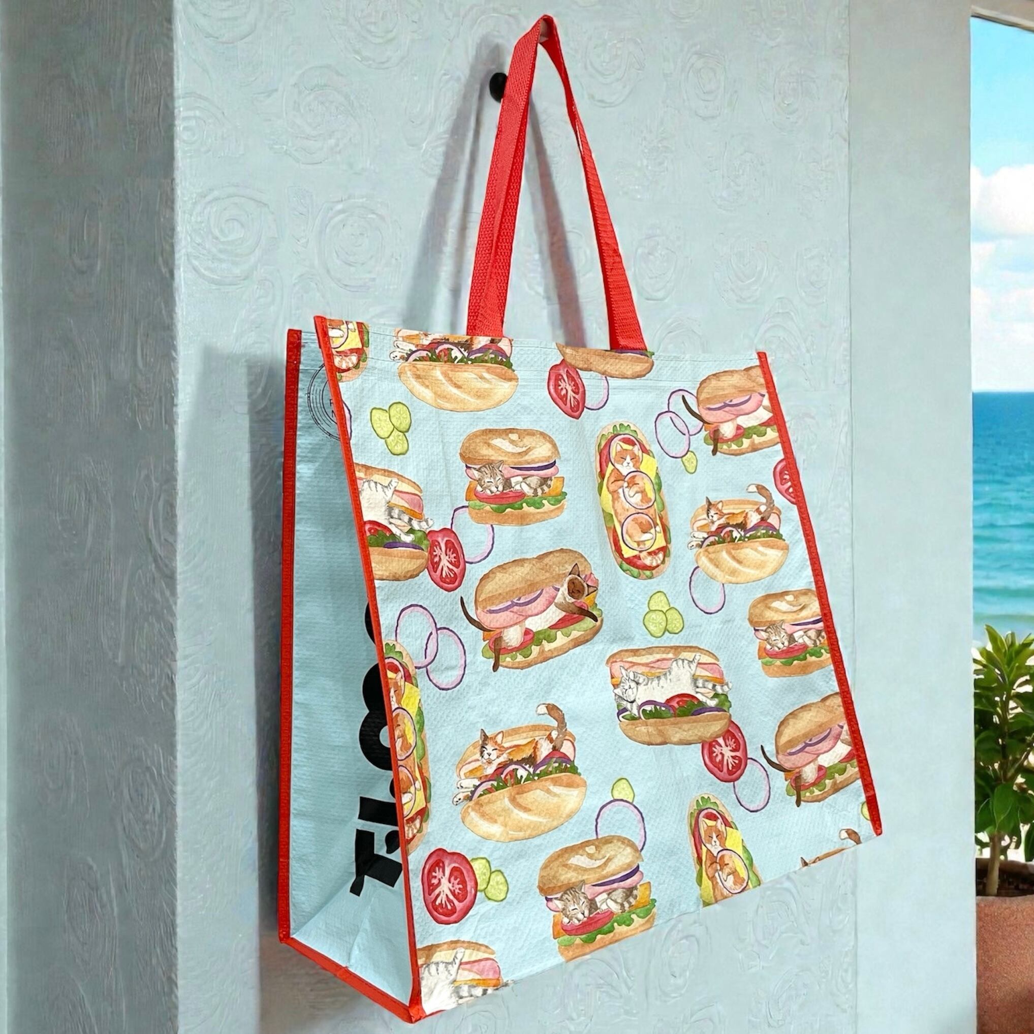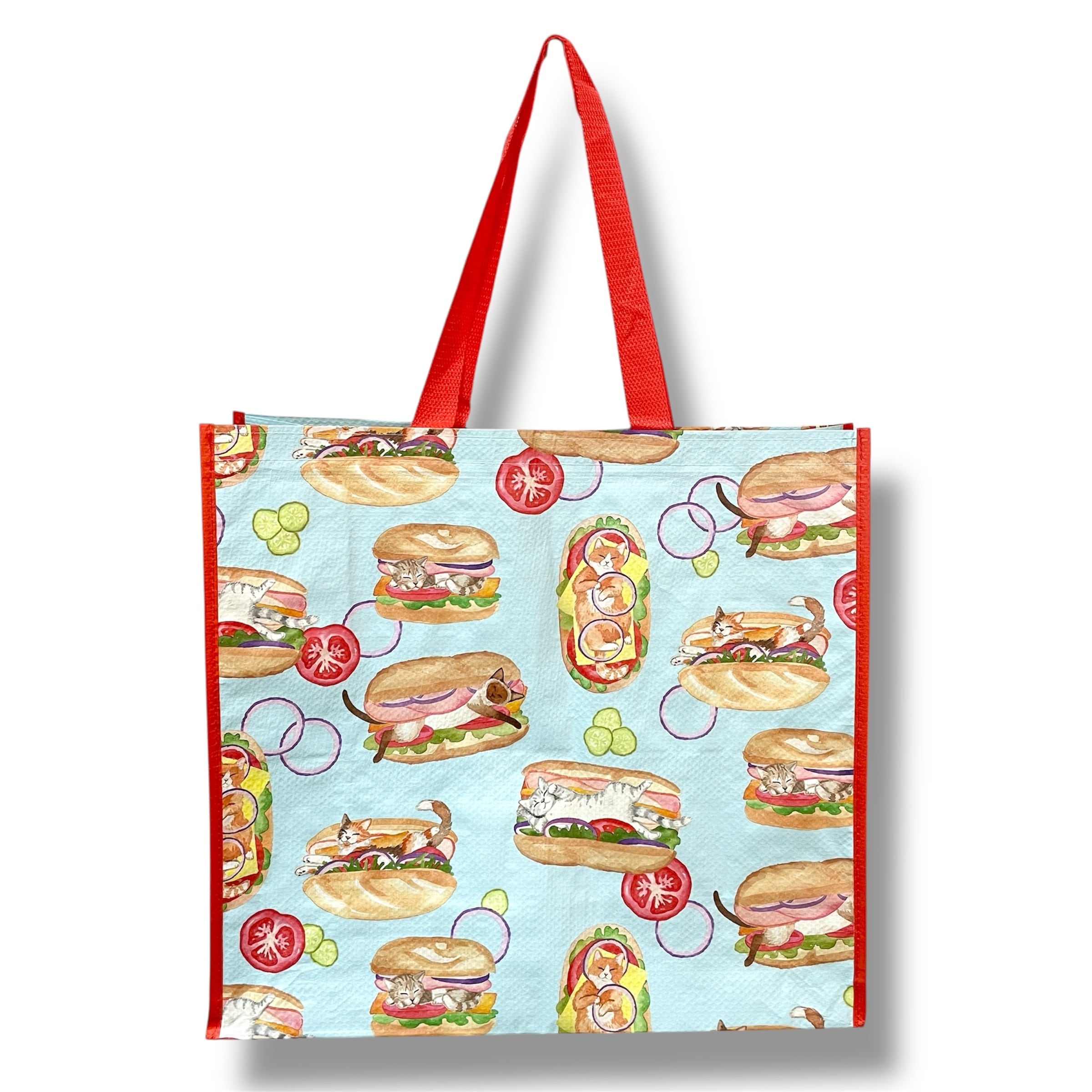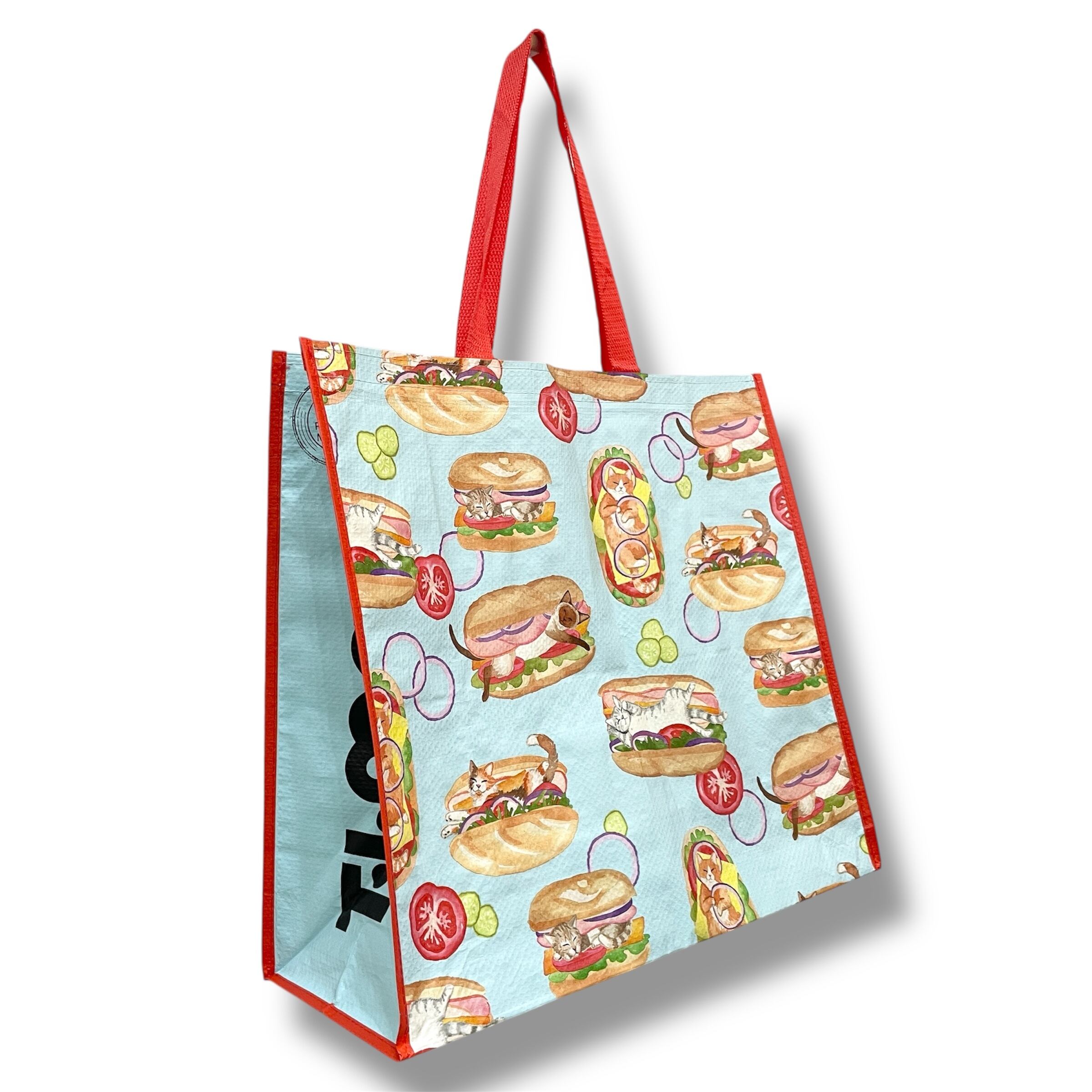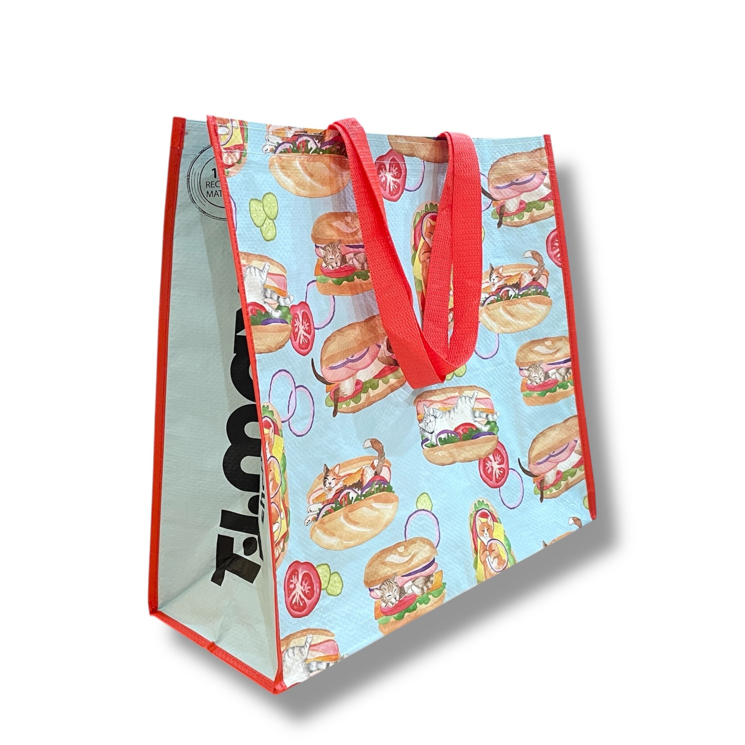 【エコバッグ】ポリプロピレン ネコ キャット ホットドッグ イラスト ポップ レッド ブルー マルチカラー トートバッグ ショッピングバッグ マチあり ハワイ HAWAII ハワイ入荷 海外輸入 プレゼント