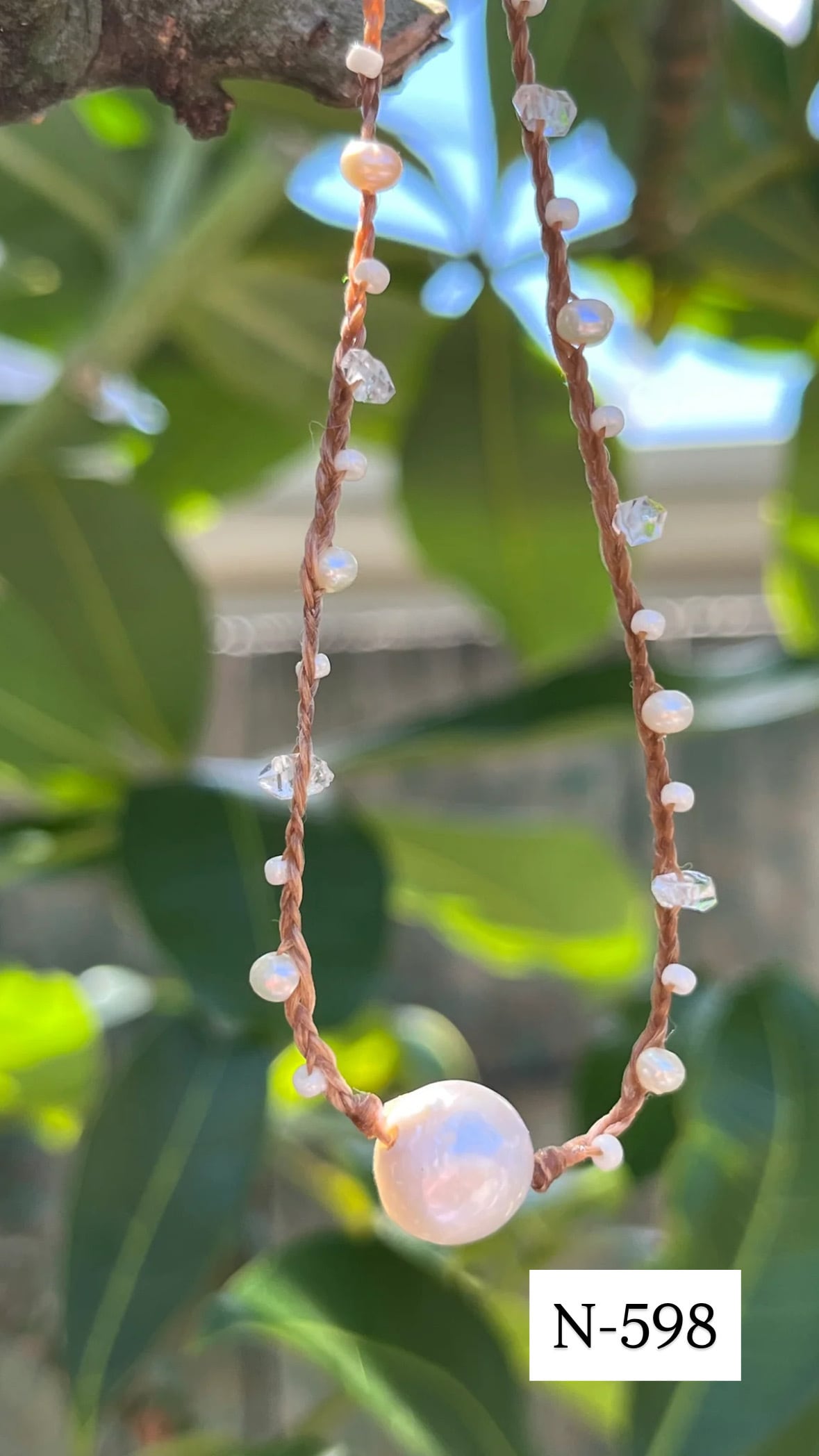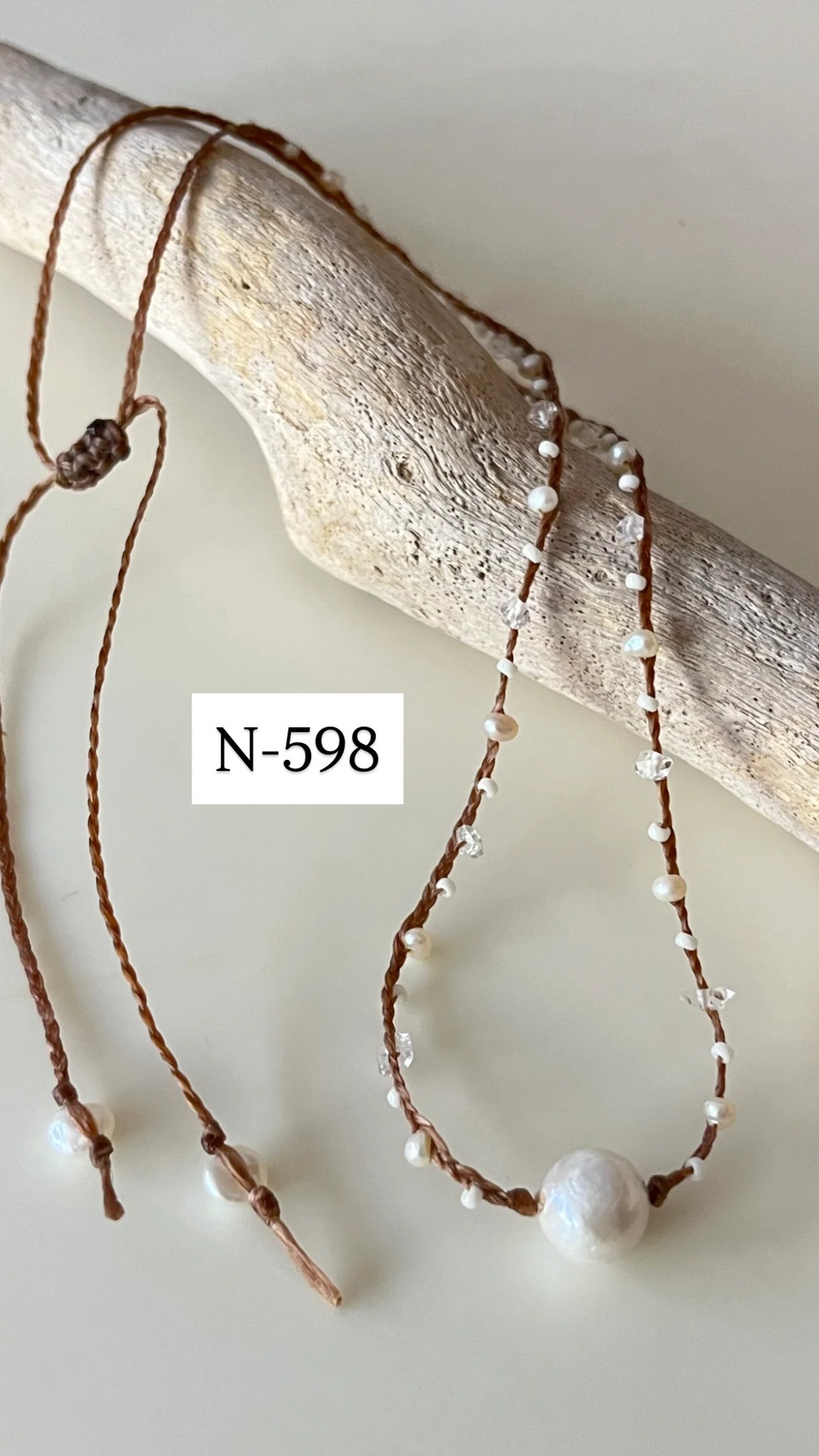 素材:ヘッドチャーム(10mmエディソンパール/ラウンド)・淡水パール(3mm)淡水パール(5mm)天然石ハーキマーダイヤモンド(ターミネイト4mm)・シードビーズ・シニュー人口ワックスコード