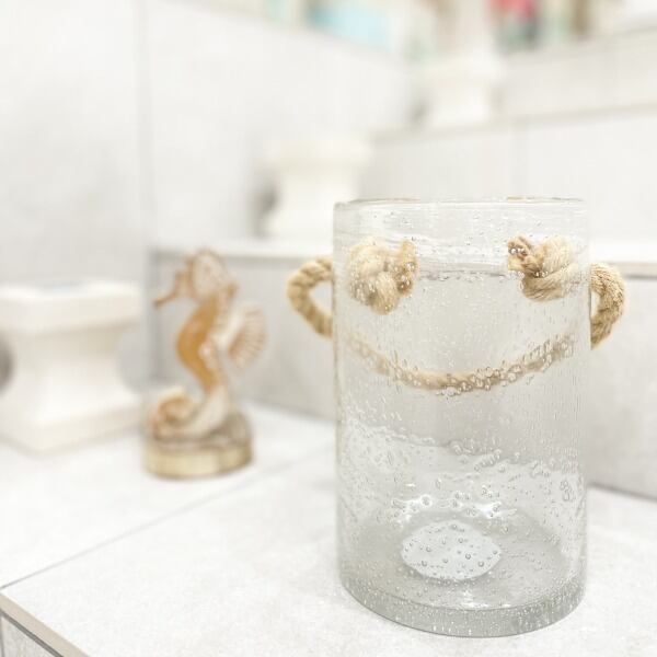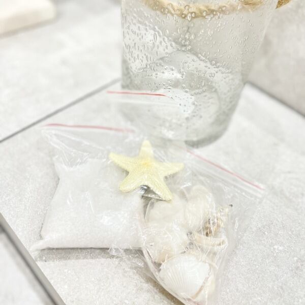 付属の貝殻、ヒトデ、砂をお好きなようにガラス素材の本体の中に入れていただだくことで、