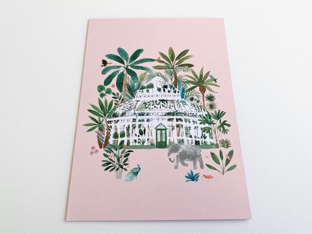 ピンクに植物園と動物のイラストが描かれたおしゃれなカード!