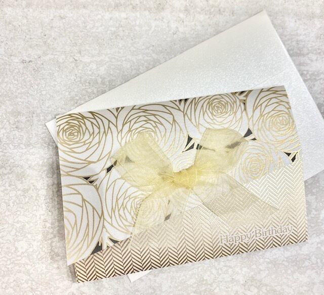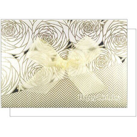 高級感のある紙に箔押しした薔薇のイラストとオーガンジーのリボンの組み合わせがとても上品なバースデーカードです。