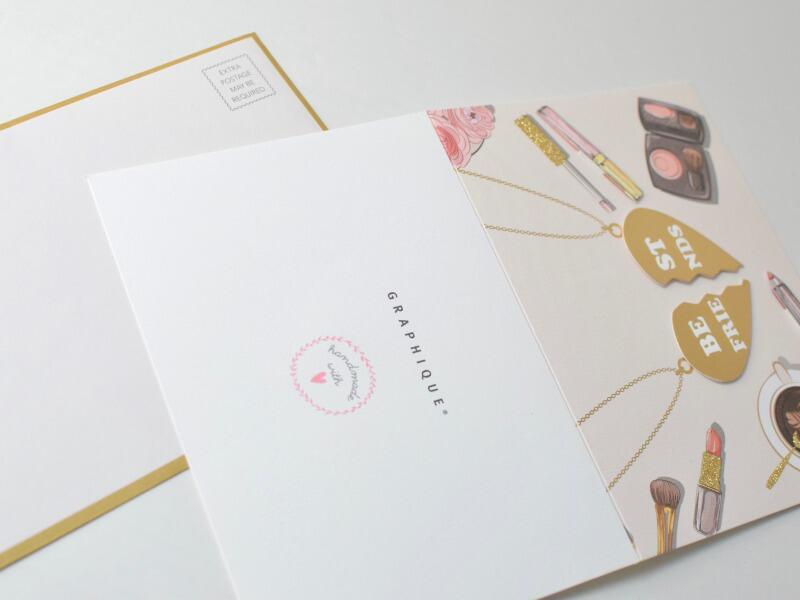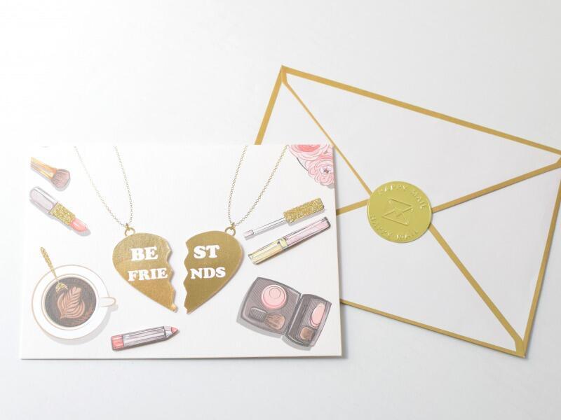 ガールズらしい、ゴールドのラメが光るリップグロスや親友の印のネックレスなどがデザインされたとってもおしゃれなグリーティングカードです!