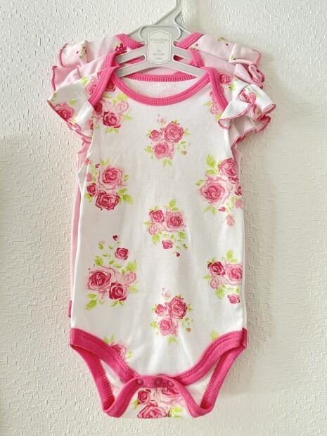 女の子らしい花柄のピンクロンパースがセットになったベビーウェアが入荷いたしました。