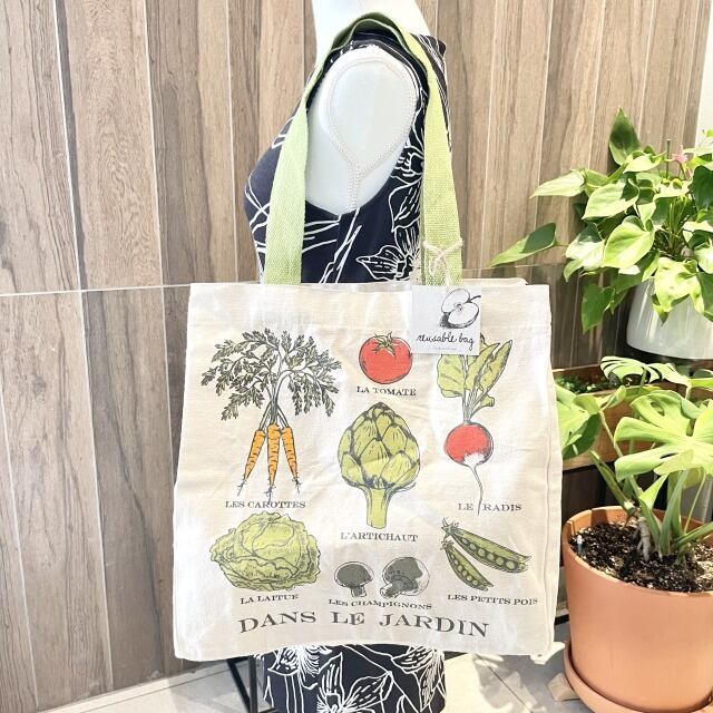 【tote bag】スクエア トートバッグ ショッピングバッグ コットン グリーン ベジタブル柄 野菜柄 マチあり 海外品 輸入 海外輸入 ハワイ HAWAII インポート プレゼント