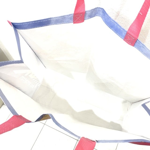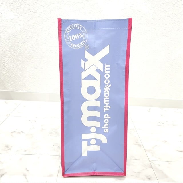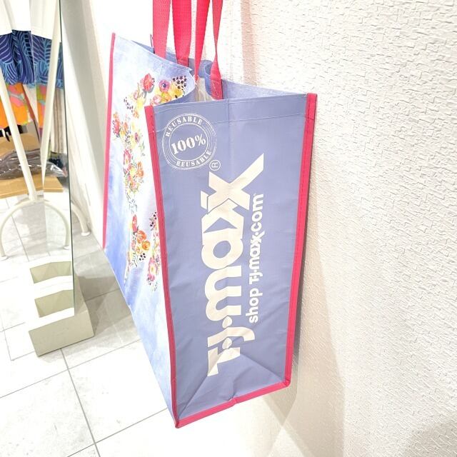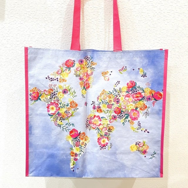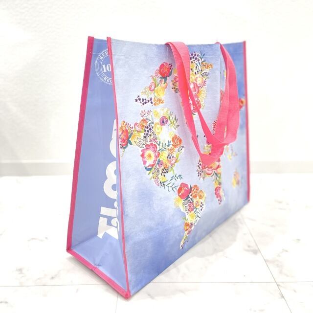 淡い紫色の背景にバッグの淵は目立つピンク色で、可愛らしい花がプリントされたエコバッグが入荷いたしました。