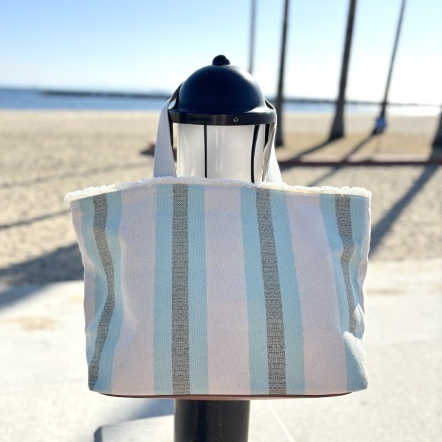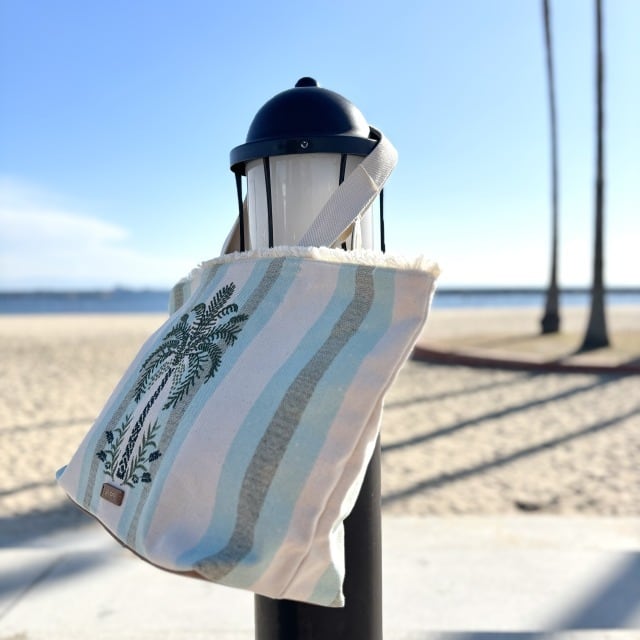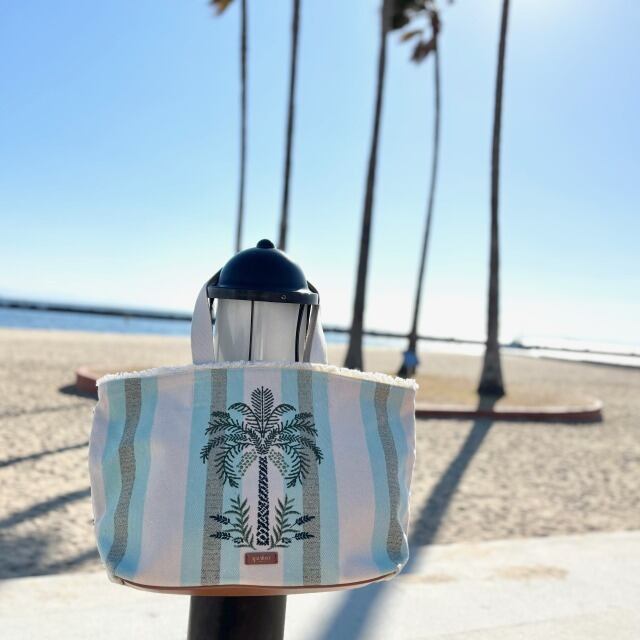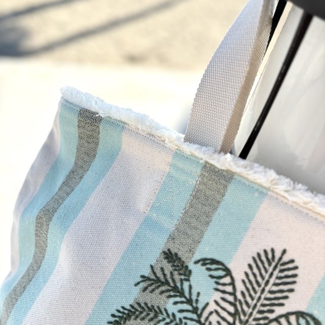 厚く耐久性のあるストライプのコットンキャンバスにヤシの木の刺繍が施されているトートバッグです!