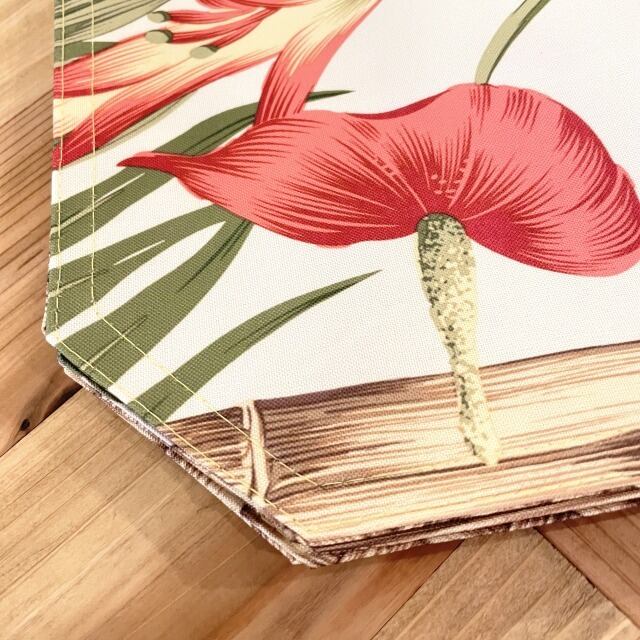 【Kauhale Living】ランチョンマット 4枚セット ハワイ ファブリック テーブルマット ハワイアン柄 アンセリュウム お花柄 リーフ柄 グリーン レッド イエロー ラウハラ柄 リバーシブル 100%ポリエステル 防汚コーティング 海外 海外輸入 プレゼント