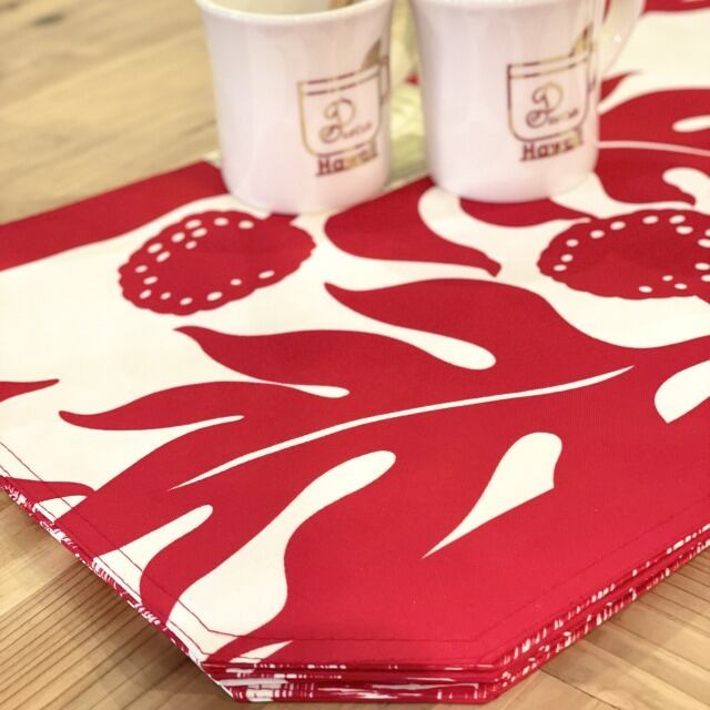 【Kauhale Living】ランチョンマット 4枚セット ハワイ ファブリック テーブルマット ハワイアン柄 ウル パンの木 ulu レッド ホワイト ラウハラ柄 リバーシブル 100%ポリエステル 防汚コーティング 海外 海外輸入 プレゼント