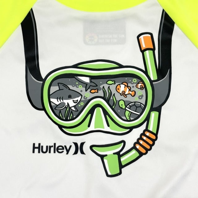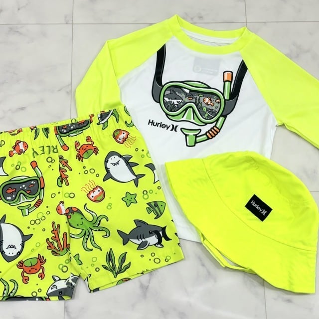【Hurley】3-PIECE SWIM SET ハーレー キッズ 水着 3点セット 2歳 3歳 水泳 水泳着 ラッシュガード パンツ ハット ボーイ 男の子 イエロー 黄色 蛍光 ホワイト 白 魚 夏 プール 海 ハワイ 海外品 海外輸入 ギフト 贈り物