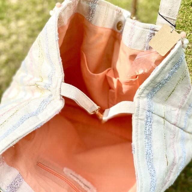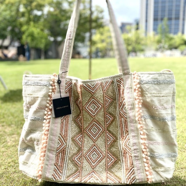 前面にビーズ刺繍が施された、鮮やかなカラーのトートバッグ