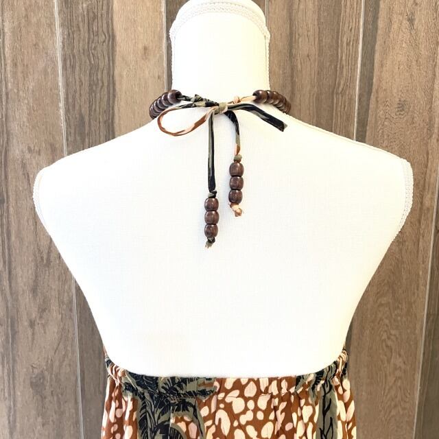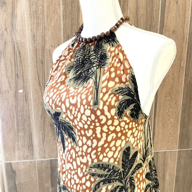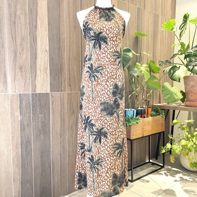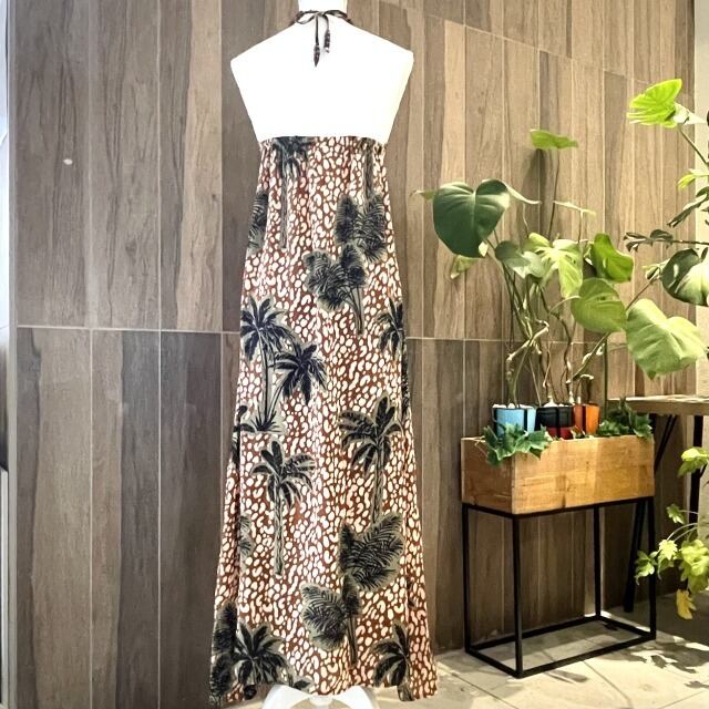 【The Destiuatious】【サマードレス 】ロング丈 ホルターネック ブラウン ヤシの木 リゾート風 海 ハワイアン ハワイアン柄 レディース ファッション 夏 サマー ビーチ バカンス ハワイ HAWAII プレゼント レーヨン mu