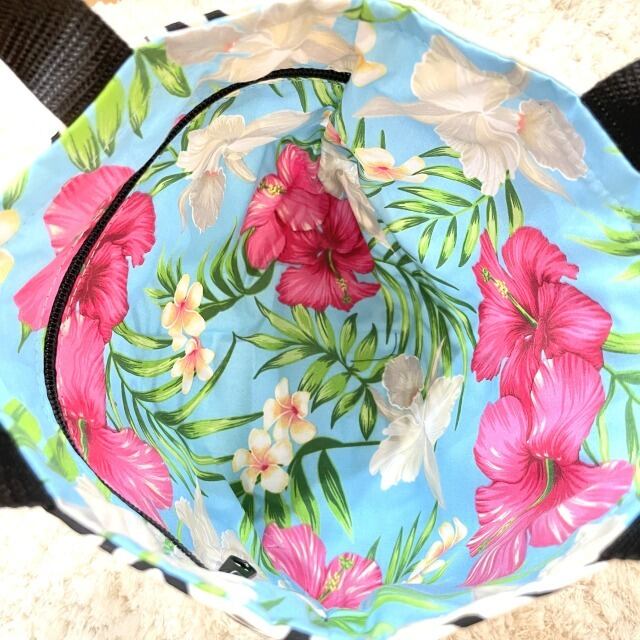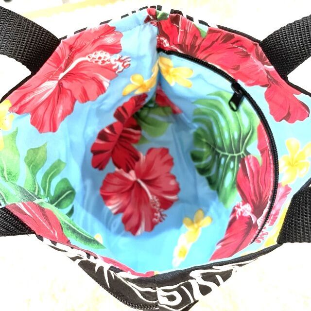 ハワイアン柄のリバーシブルになっており、両面に大きなファスナー付きポッケト付き!