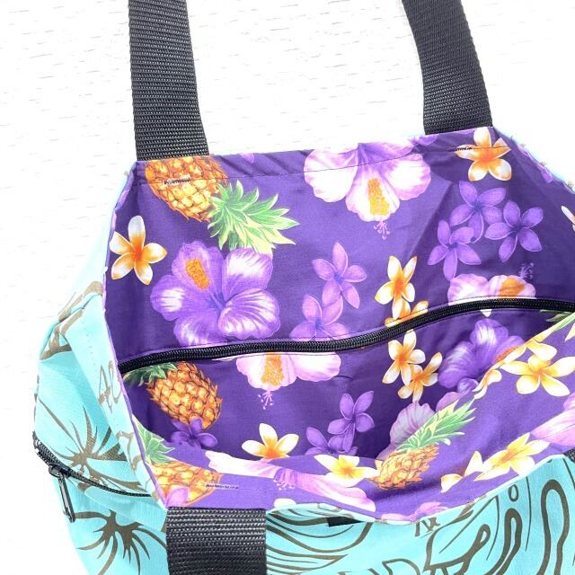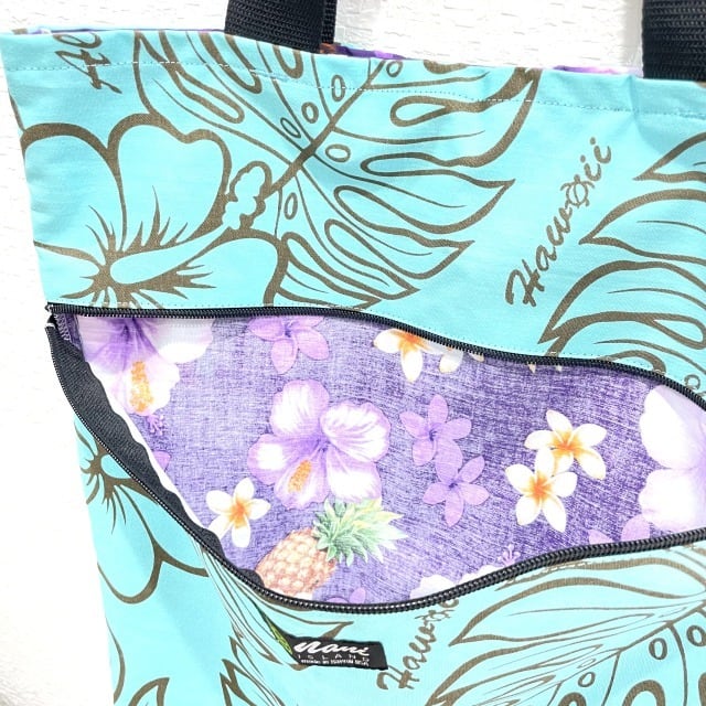 ハワイアン柄のリバーシブルになっており、両面に大きなファスナー付きポッケト付き!