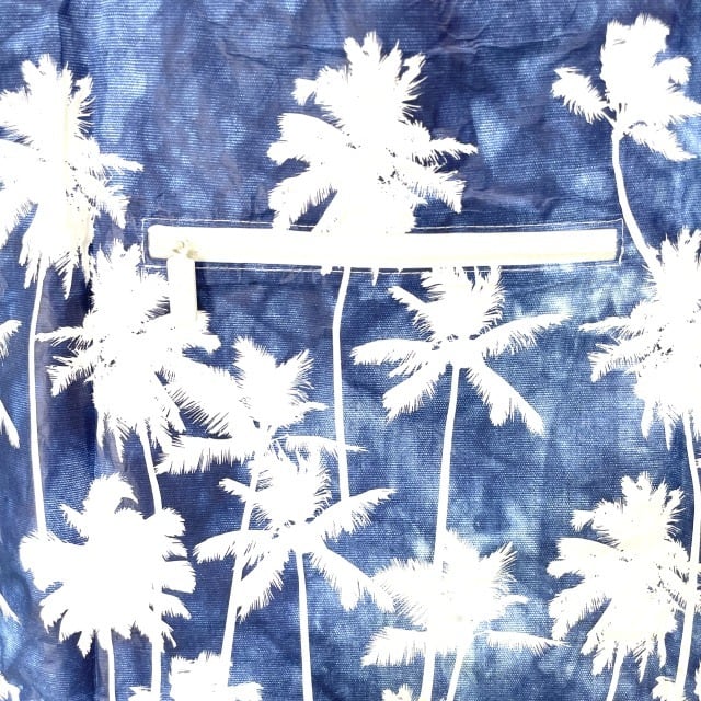 鮮やかなブルーのバッグにヤシの木がたくさんプリントされ、男女ともに使いやすいデザイン☆