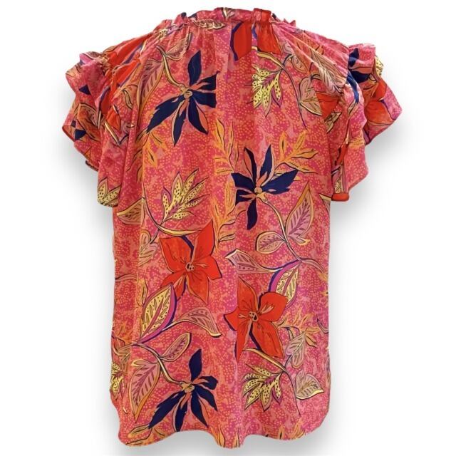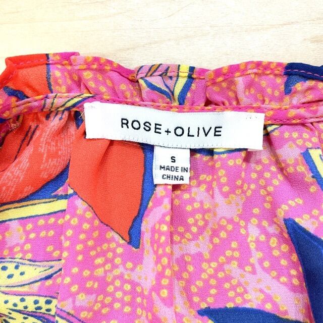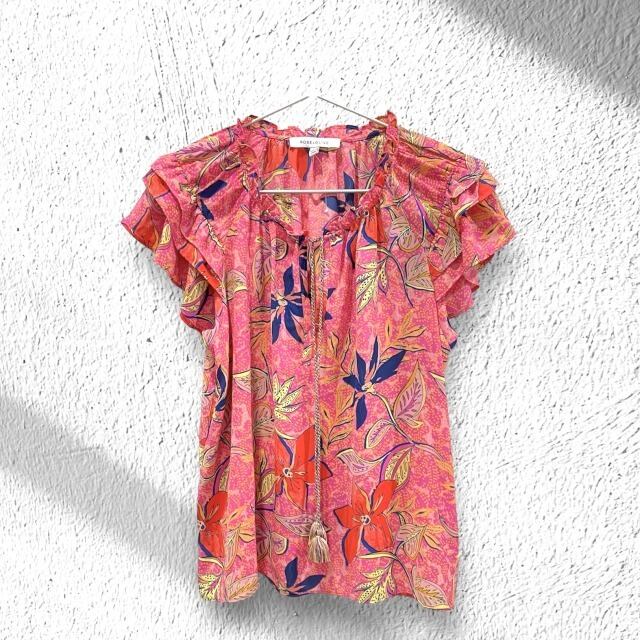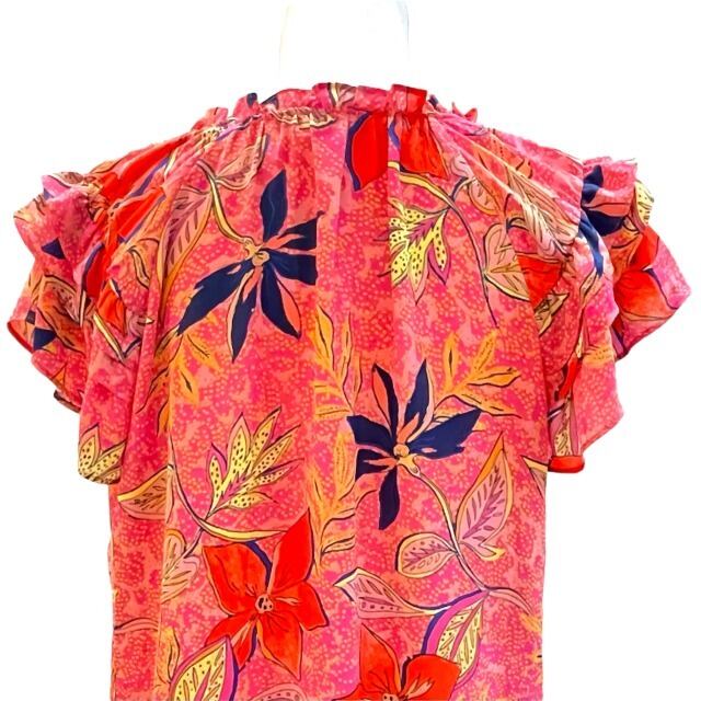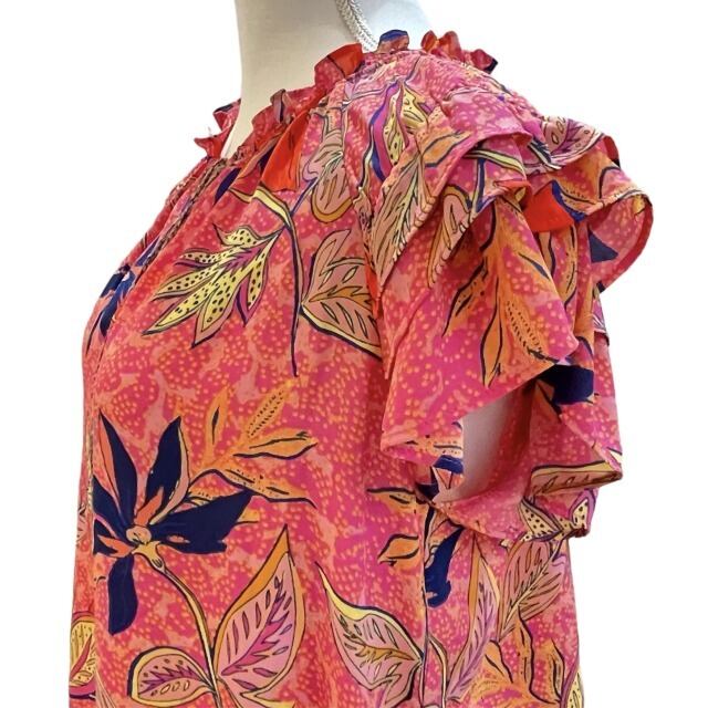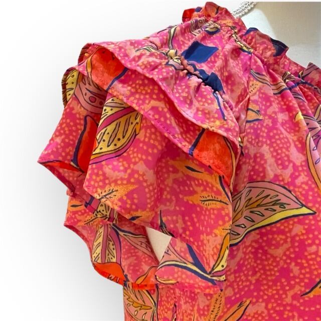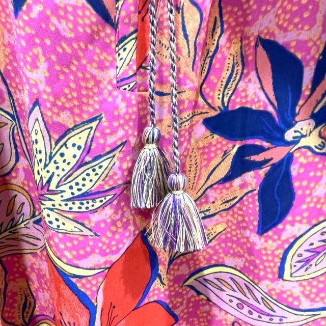 【ROSE+OLIVE】【ブラウス】ブラウス USSトロピカル柄 フレアー袖 可愛い 被り フリンジリボン ピンク オレンジ ネイビー レディース インポート HAWAII ハワイ 海外輸入 mu