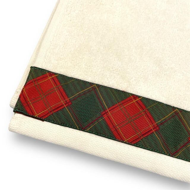 クリスマスツリーの刺繍に裾のチェックリボンがクリスマスの華やかさを感じさせます。☆