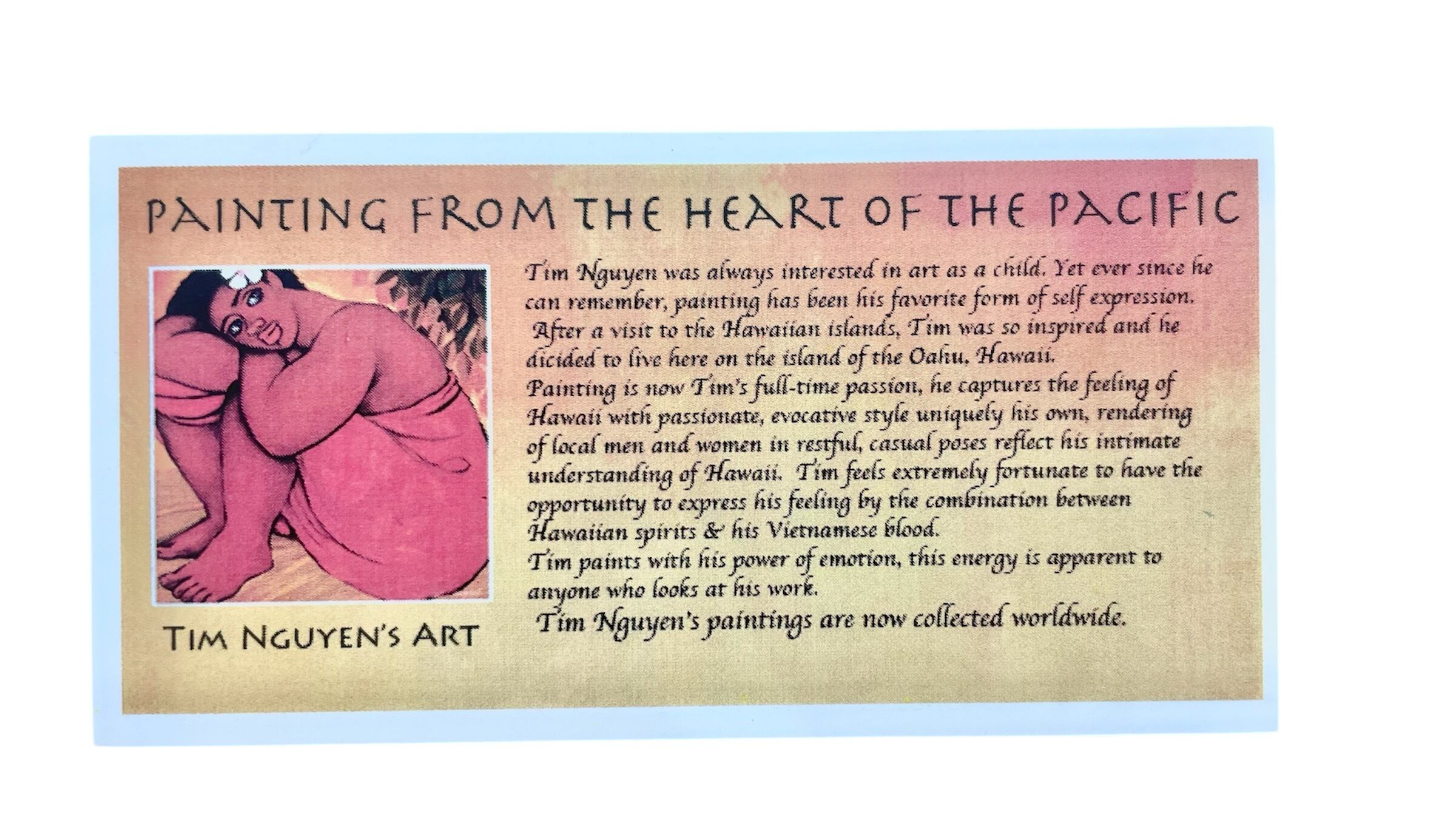 ゴーギャンのようなトロピカルで温かみのある油絵が人気で世界中にファンを持っている。
